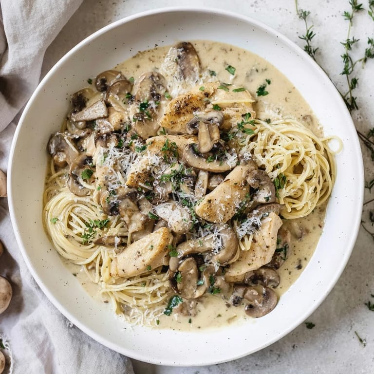 Save to Pinterest My apartment tiny and drafty, this mushroom chicken pasta became my Tuesday survival dinner. The way cream sauce clings to skinny noodles feels like a warm blanket after a long day at work. I started making it when my budget was tight but my craving for comfort food was high. Now it is the first thing I cook when friends say they are over for dinner.